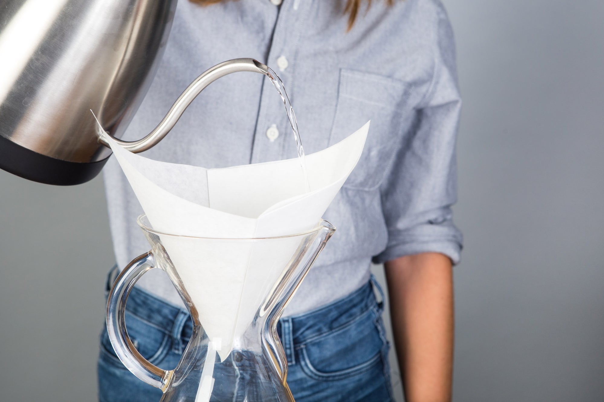 Put the Chemex filter in the carafe with the thicker, triple-fold portion facing the pour spout without obstructing it. Rinse the filter thoroughly and swirl the water around the chamber to remove the papery taste. Empty the chamber.