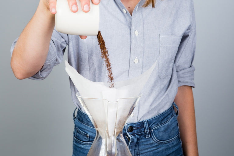 For other Chemex sizes, simply apply the same ratios as we have here: for each cup, use 8 g (1 rounded tbsp) coffee and 148 g (5 oz) water.