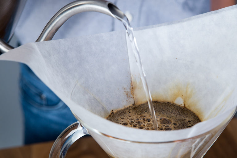Pour the water over the coffee, using enough to saturate the grounds thoroughly, but not so much as to create a pool of water. As a measure, you’ll want double the amount of water as you have grounds. Pour evenly, starting at the center then slowly spiraling outward, taking care not to pour water directly on the paper filter.