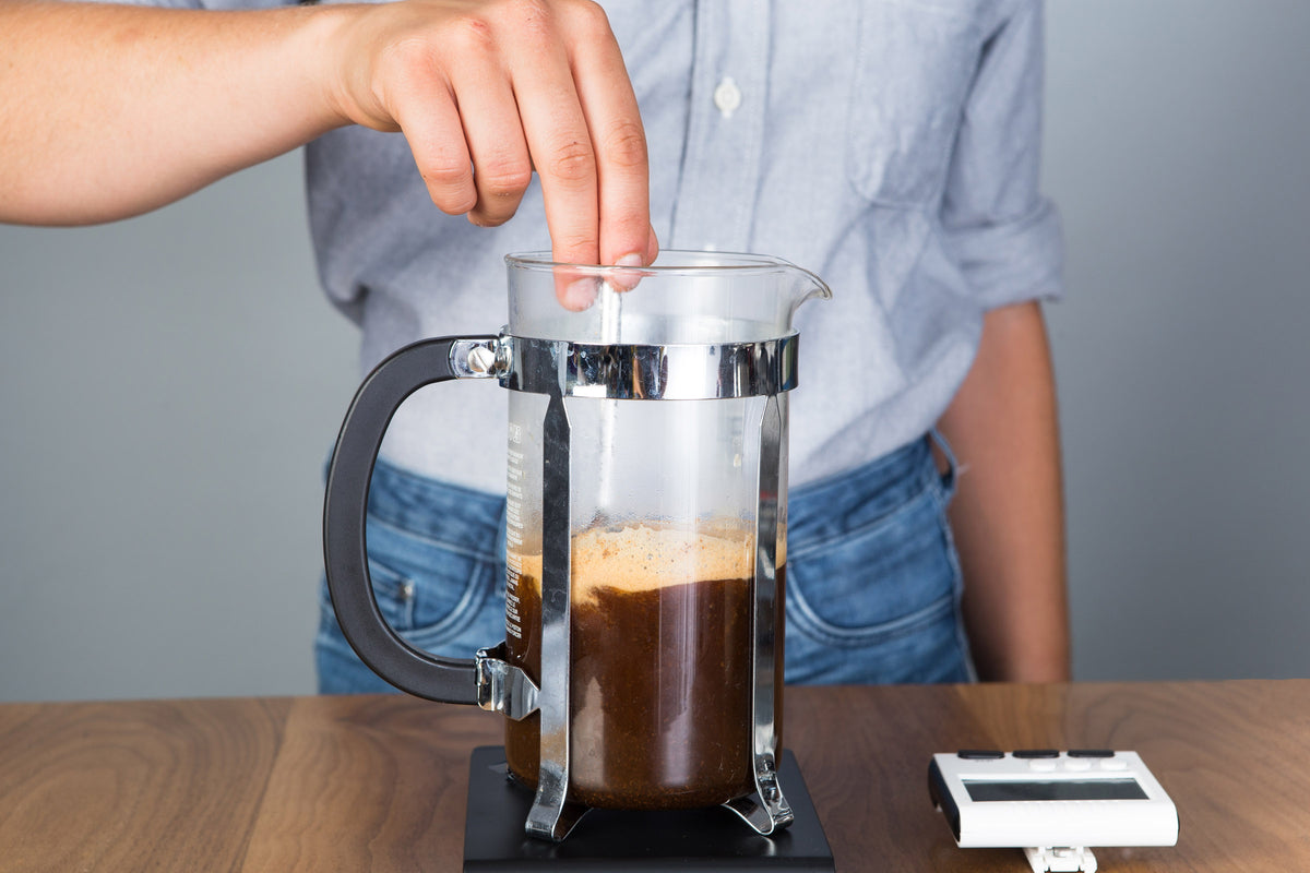 Place the lid on the French press, but don’t plunge yet! Keep the plunger all the way up, while the coffee steeps for a total of 4 minutes.