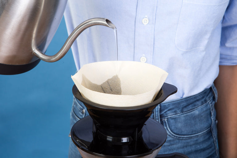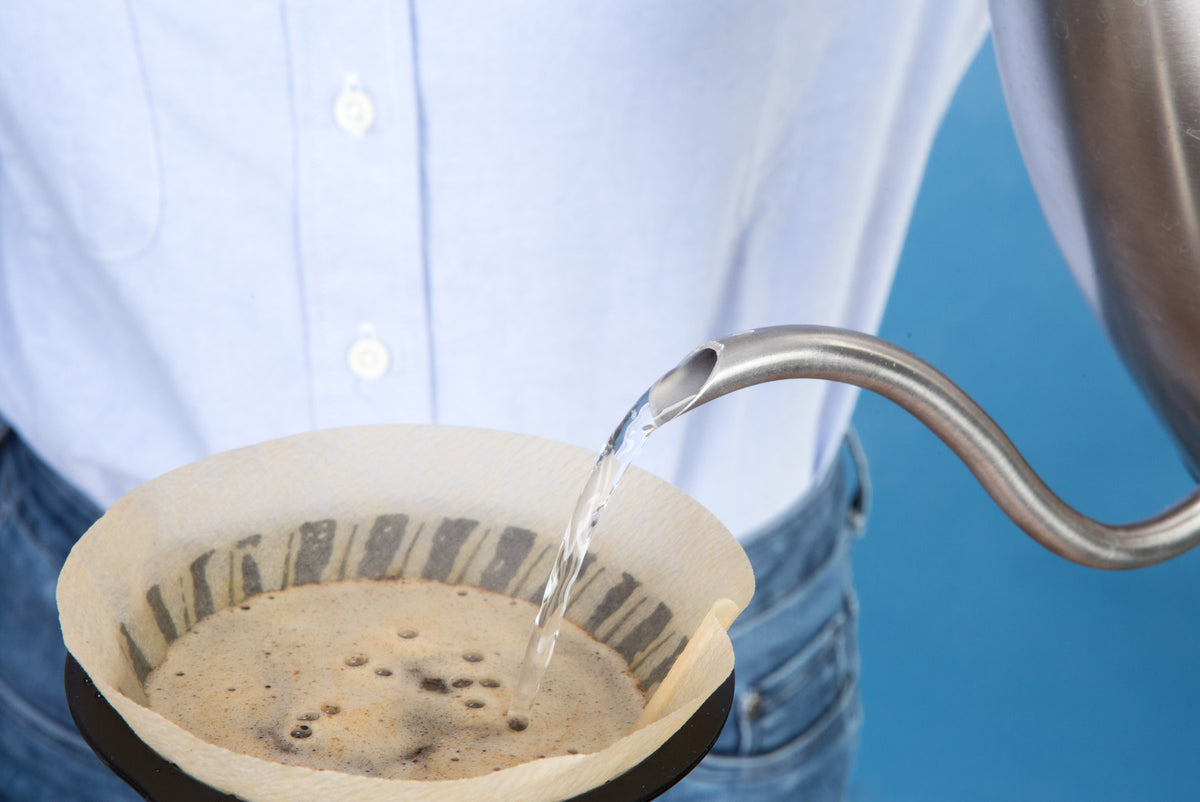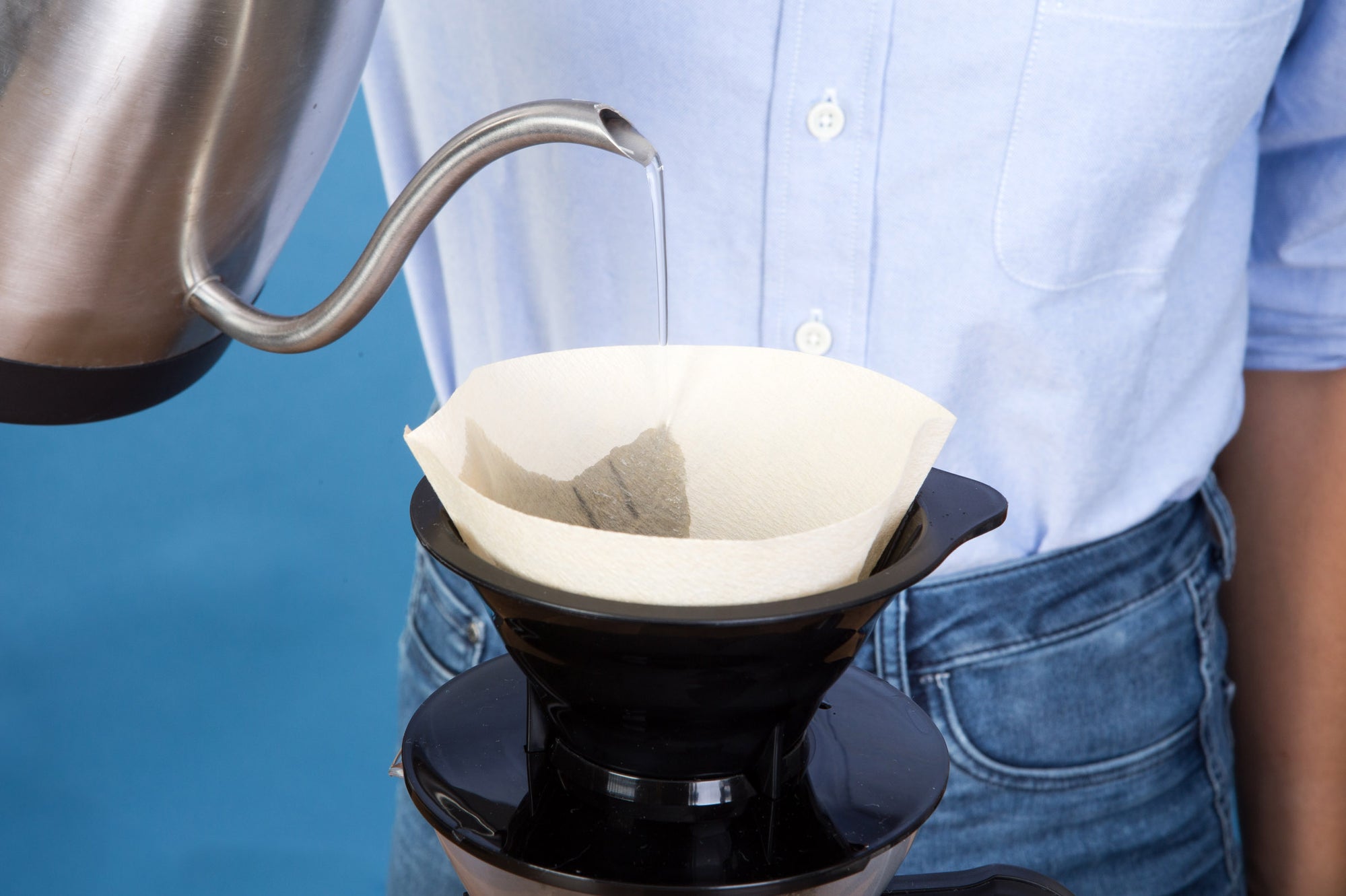 Continue pouring slowly from the center and circling around the outside until you’ve reached the right water mark level (as indicated on the carafe). Take care not to pour water directly on the paper filter.