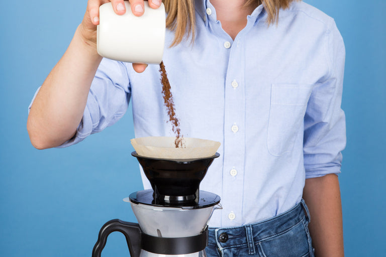Pour coffee grinds into the V60. Give it a few shakes to get everything settled and level in the filter.
